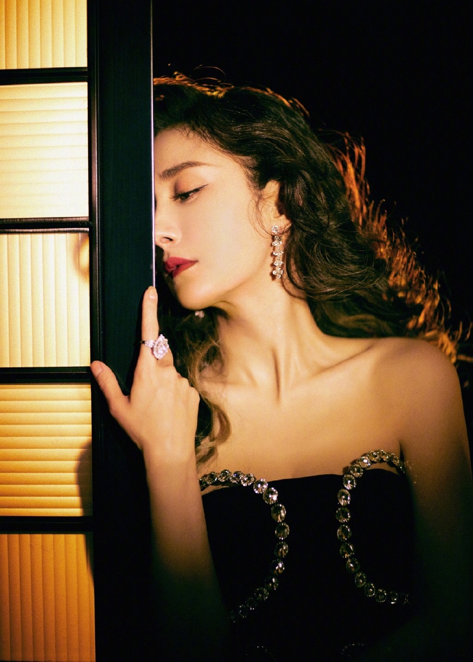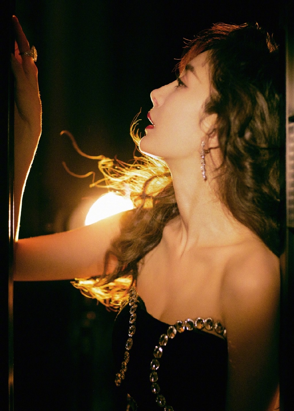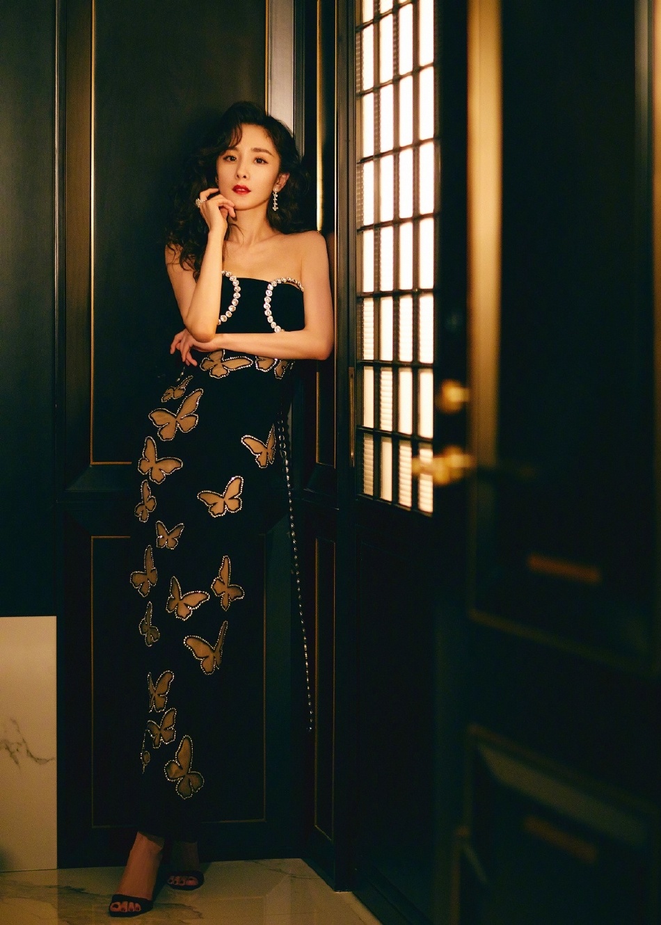 杨幂身着蝴蝶镶钻开叉长裙 复古风十足!